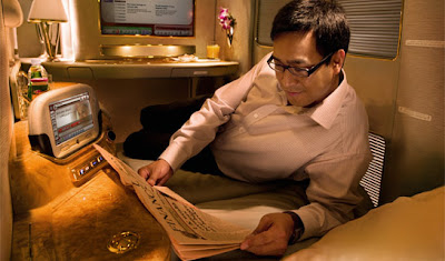 The original post that inspired this series was about the shower spa in the Emirates A380 first class cabin. This brings the posts full circle by revisiting the first class cabin again. These articles are just wishful thinking about viewing the luxury jumbo jet from afar. It's possible one day as this jet becomes increasingly common at airports around the world that more passengers will experience flying in this jet albeit if only in the coach cabin.